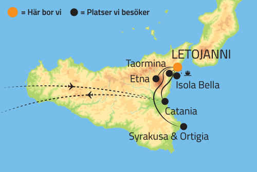 Under vår resa bor vi på Siciliens östkust drygt 45 minuter från Catania. Här hittar vi en äkta siciliansk stadsmiljö med många fastboende, fiskebåtar på stranden och ett härligt folkliv, och när det har blivit mörkt kan du sitta på en uteservering och se ljusen glittra från Taormina och Castelmola uppe i bergen. I Giardini-Naxos hamn finns gott om restauranger, småbutiker och kaféer, och härifrån kan den som önskar också till exempel ge sig iväg med båt till ön Isola Bella, där möjligheten finns att snorkla och utforska de häftiga grottorna. I Letojanni kan du betrakta sicilianarnas vardagsliv på torget och besöka den vackra kyrkan.